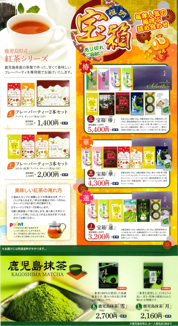 豊かな香りあるれる、かごしま茶の厳選ギフトや毎年人気の福呼ぶ詰め合わせなど、ラインナップしております。 2025さつま路の冬ギフト をぜひご利用下さいませ。